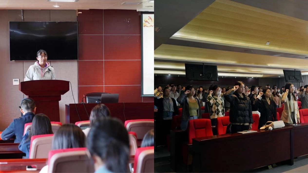 新生党员代表博士生任同宣读了《报效祖国 青年有责》——致成人网 全体同学的倡议书,倡议书强调青年党员应该立大志、明大德、成大才、担大任,把论文写在祖国大地上。随后,在新生党员代表硕士生李沅洁领誓下,全体党员重温入党誓词,立志永葆党性、矢志担当。