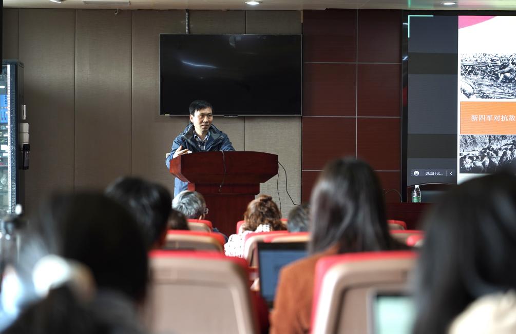 党课伊始,作为新四军二代的刘维荣教授通过两段视频,生动讲述了自己受到父辈的影响而致力于研究父辈们的革命历史的心路历程。通过动人的讲述、感人的记忆让党史学习的内容鲜活了起来。接着,刘维荣教授以“新四军教育事业建设蕴涵的铁军精神”为主题,围绕新四军教育事业的主要类型和新四军教育所蕴含的铁军精神两个部分展开,通过旁征博引,向大家讲述了鲜为人知的历史情节,用饱含真情实感的故事细节感染了现场每位同志。
