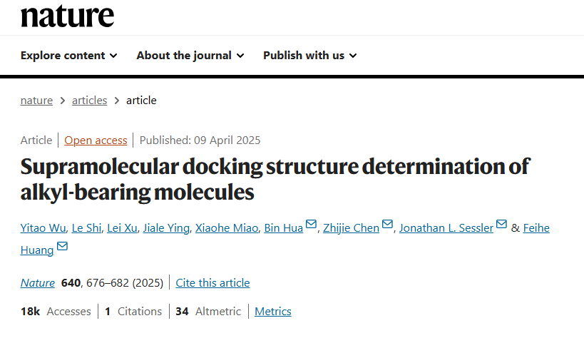 )参与合作的研究成果近期在国际知名学术期刊《自然》发表,该研究突破性开发出基于大环超分子的主客体识别新策略,通过包裹技术将难结晶的分子稳定于大环空腔中,成功实现该类分子结构的确定。这一方法不仅攻克了传统X射线衍射技术对分子结晶度的严苛要求,更为复杂有机分子的结构表征提供了高效、普适的解决方案。