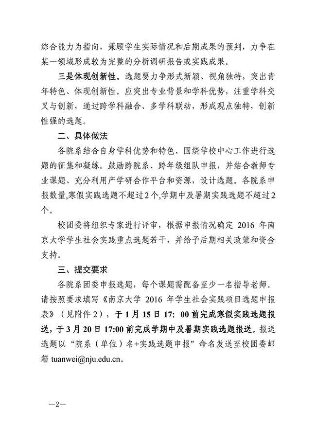 成人网 2016年学生社会实践选题征集工作已经启动。希望大家根据通知要求,主动思考,积极申报,后期学院将视选题质量给予相应政策支持。请有意申报的个人或团队在规定时间内将实践选题申报材料发送到院团委邮箱[email protected]。寒假实践选题报送截止时间:1月14日;学期中及暑假实践选题报送截止时间:3月10日。