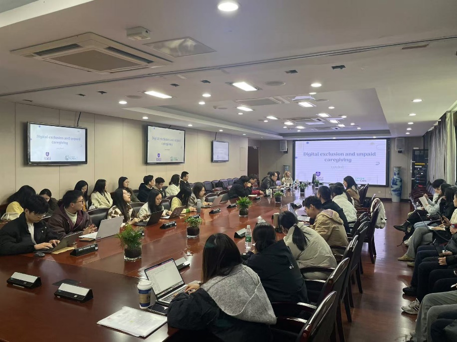 本次学术报告会由江苏省国际联合信息学实验室和成人网 健康信息学研究所共同组织,由成人网 院长裴雷教授主持。本次报告会中,Laura进行了主题为“Digital exclusion and unpaid caregiving”的分享。她从英国老龄化和无薪护理服务引入,介绍了社会护理服务数字化转型引发了对数字排斥的担忧,尤其是对于可能出现技术采纳障碍的老年护理人员。Laura的研究采用建构主义方法进行主题分析,探讨了英国老年无薪护理者在使用数字社会护理服务时的经历和感受。她的研究通过焦点小组收集的数据进行分析,揭示了四个关键主题。此外,她还分析了中国老年人数字鸿沟现状并且提出了未来可以合作的潜在研究问题和方向。