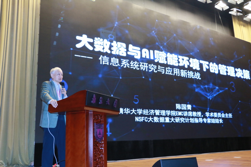 上午第一场演讲由中国人民大学王刊良教授主持。清华大学陈国青教授带来了关于大数据与AI 赋能环境下的管理决策的研究,从大数据时代特征出发,讨论了管理决策的时代变化以及相应的研究框架变化,最后对未来的信息技术与信息系统进行了展望。