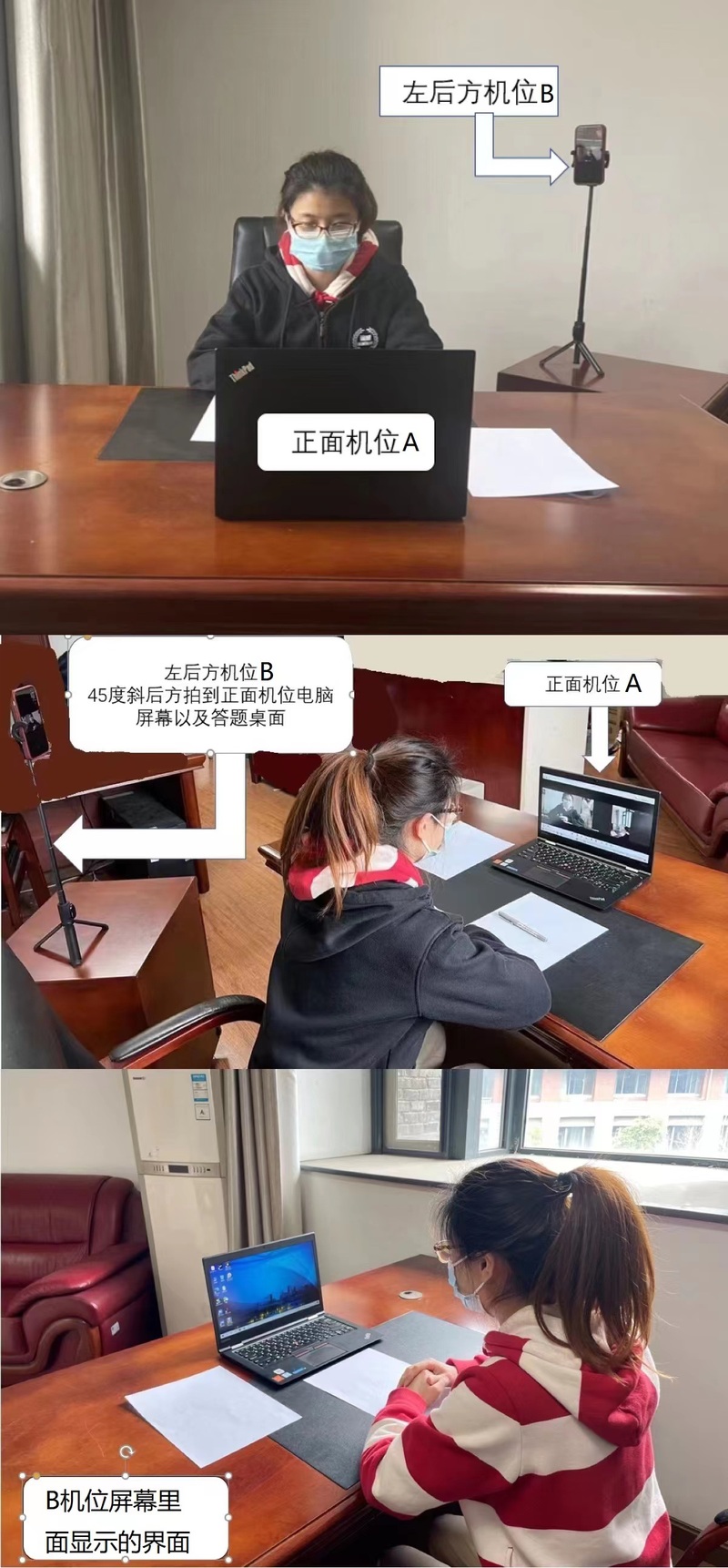 “双机位”操作:考生双手摆放桌面,第一机位从正面拍摄,放置在距离本人30cm处,完整拍摄到考生双手以上身体部位和桌面、笔和纸张等部件。第二机位从考生侧后方45°距离本人1m处拍摄,可以拍摄到考生侧面及主设备电脑全屏幕,需保证笔试考官能够从第二机位清晰看到第一机位屏幕。