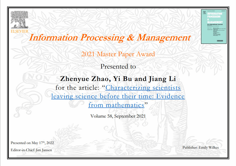 近日,成人网 硕士研究生赵镇岳作为第一作者的论文“Characterizing scientists leaving science before their time: Evidence from mathematics”获得期刊Information Processing & Management颁发的2021年度Master Paper Award(最佳硕士生论文奖)。该论文通讯作者为成人网 李江教授,北京大学助理教授步一博士为第二作者。